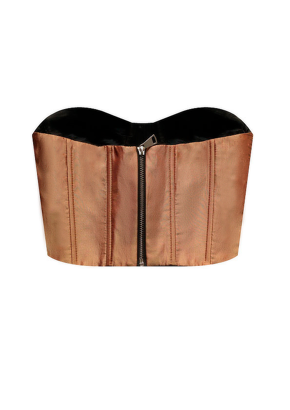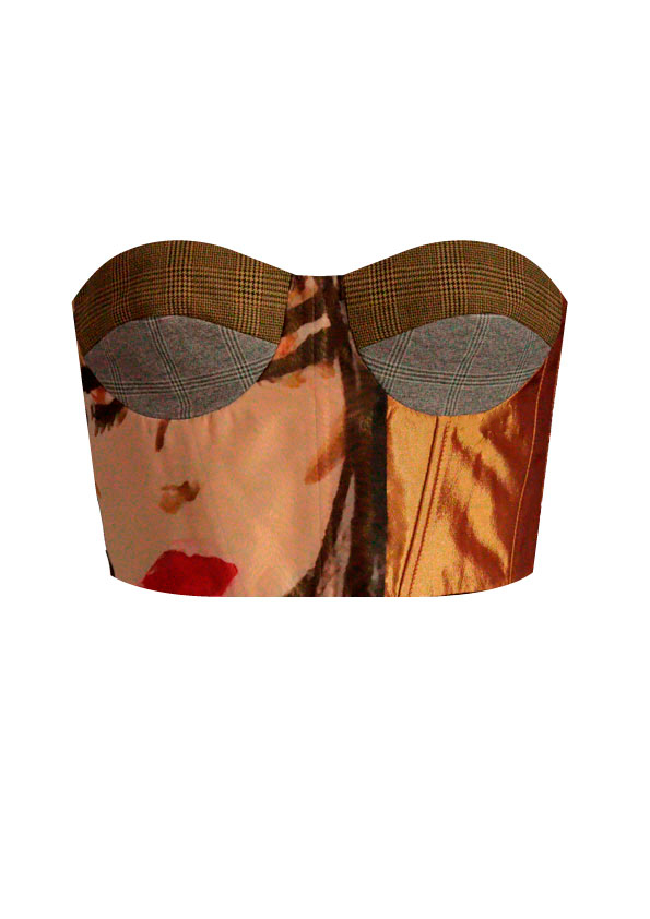 BUSTIER DE BASE TAFETA CON DETALLE DE GASA ESTAMPADA EN DELANTERO DERECHO.