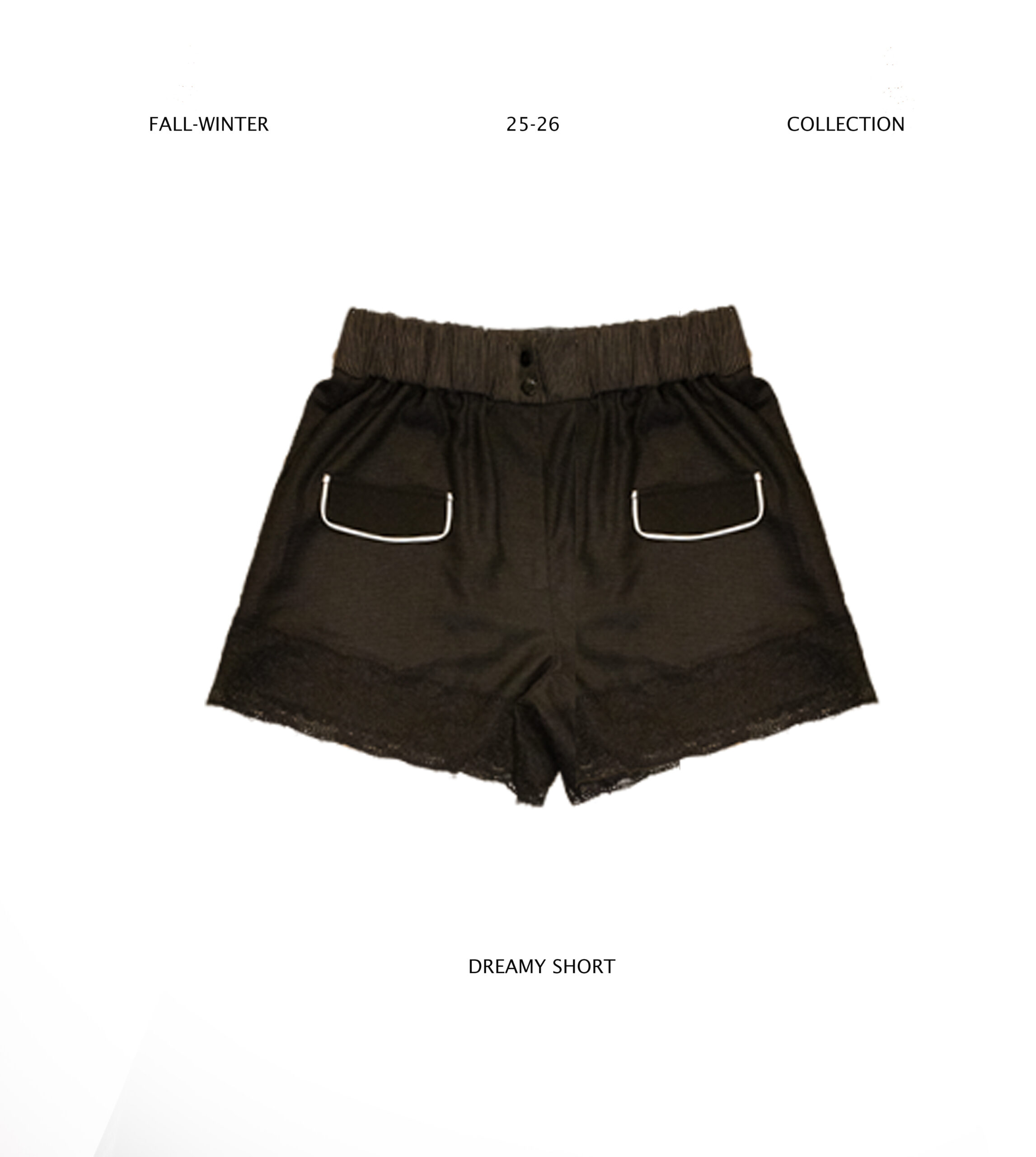 SHORT DE CASIMIR CON ELASTICO EN CINTURA, CARTERAS EN CONTRASTE Y ENCAJE EN RUEDO.