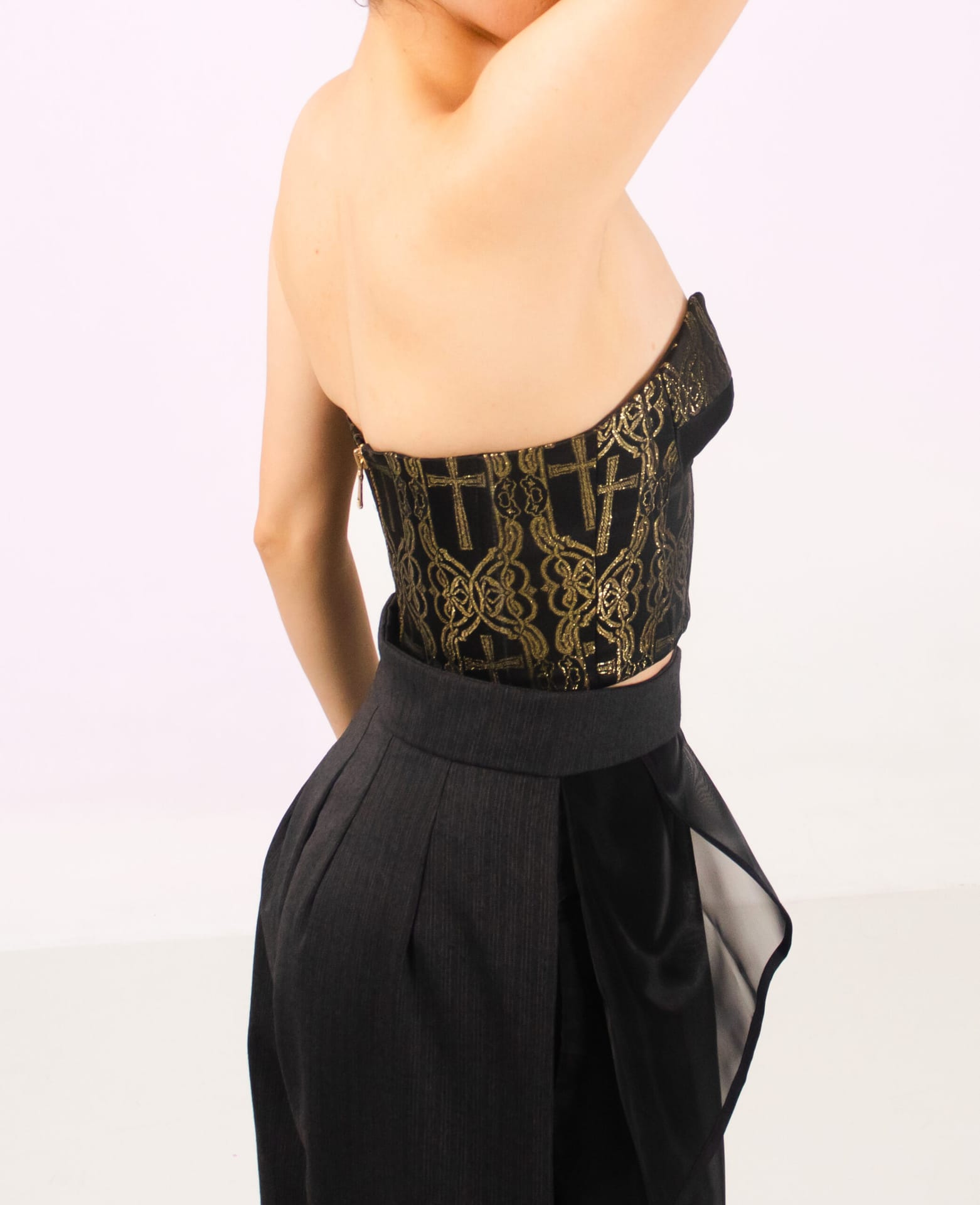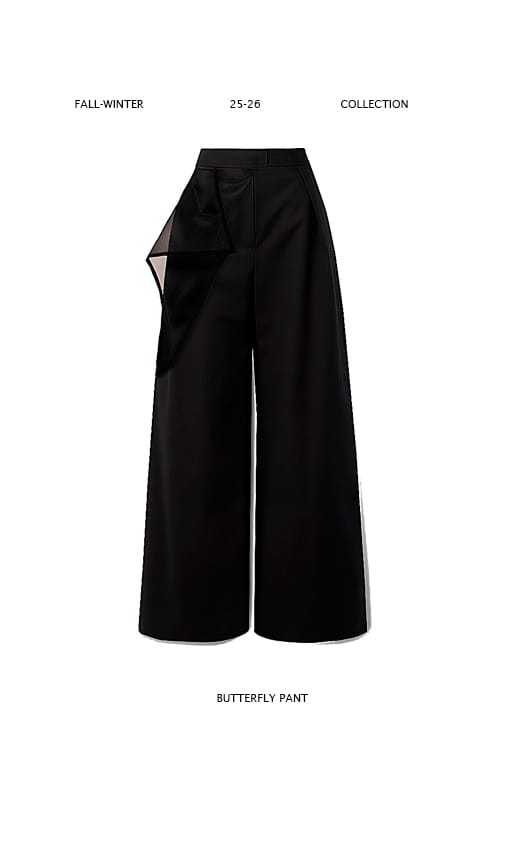 PANTALON DE CASIMIR CON ESCAROLA EN PIERNA DERECHA DE TULL. UN DISEÑO ASIMETRICO Y ELEGANTE.